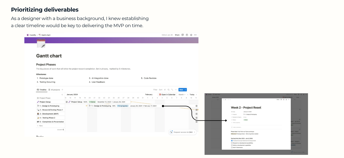 A successful project starts with a good foundation. My foundation for this project consisted of a notion site, Gantt chart, and Figma page. Consolidating all my resources in one place helped be better communicate updates with my team.