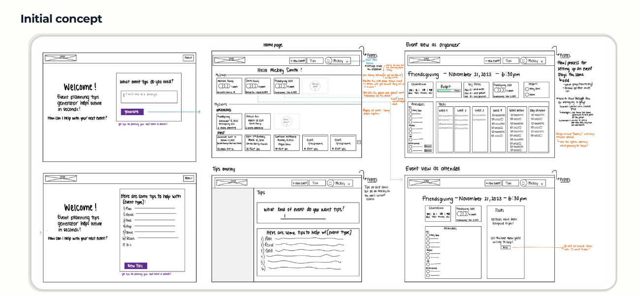 When I first started working on this project, I was focused on finding a way to make event planning more productive. I had two separate product lines of the Eventify platform to develop: the “Tips Generator” and the full concept site minimum viable product (mvp) “Prototype”. What began with a paper prototype needed to expand beyond the preliminary feature designs.