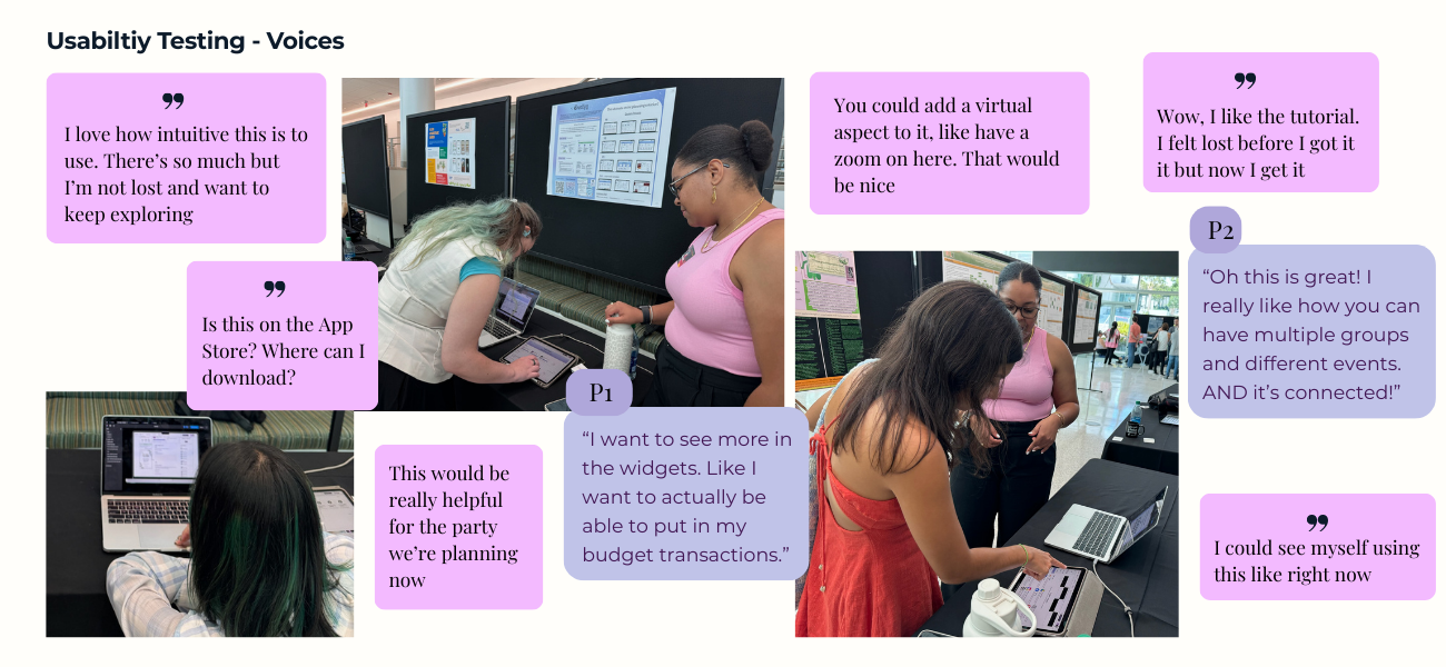 Usability testing validated core flows and highlighted opportunities to reduce cognitive load during event creation. Feedback was incorporated into the final prototype, refining navigation, task clarity, and dashboard customization. Here are the voices from the session.