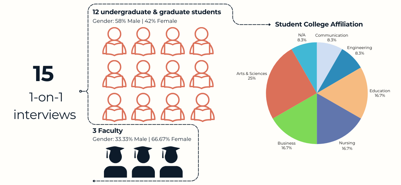 My team utilized the design thinking approach as a framework to guide design and problem solutions. Our team began the “Empathize” stage of the process interviewing current collegiate students to better understand the landscape surrounding their professional development outside of the classroom.
