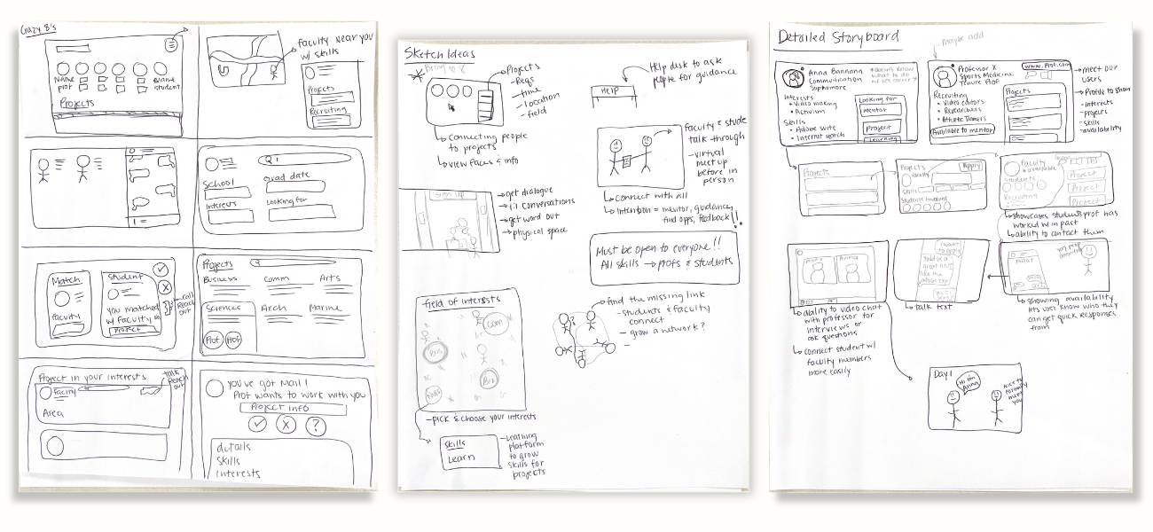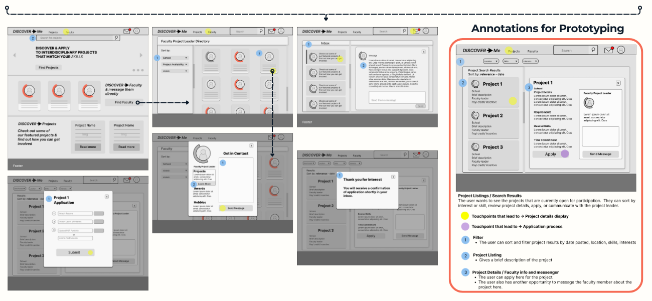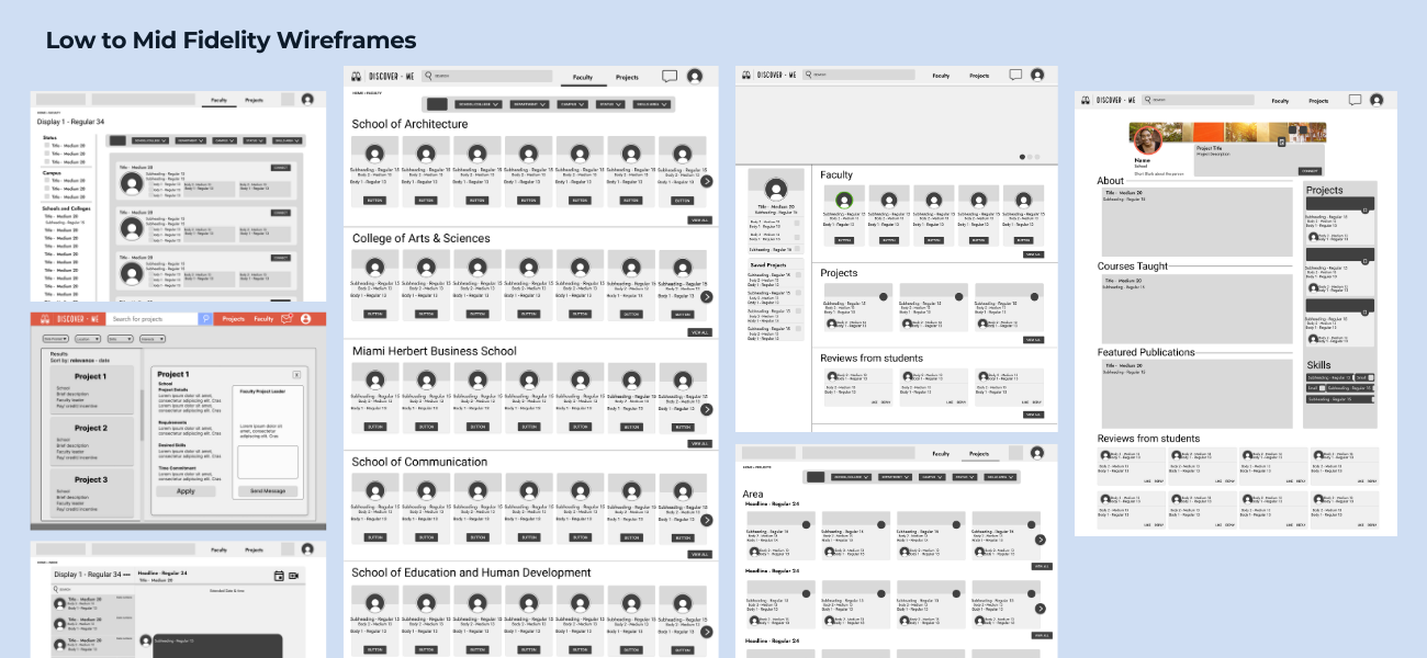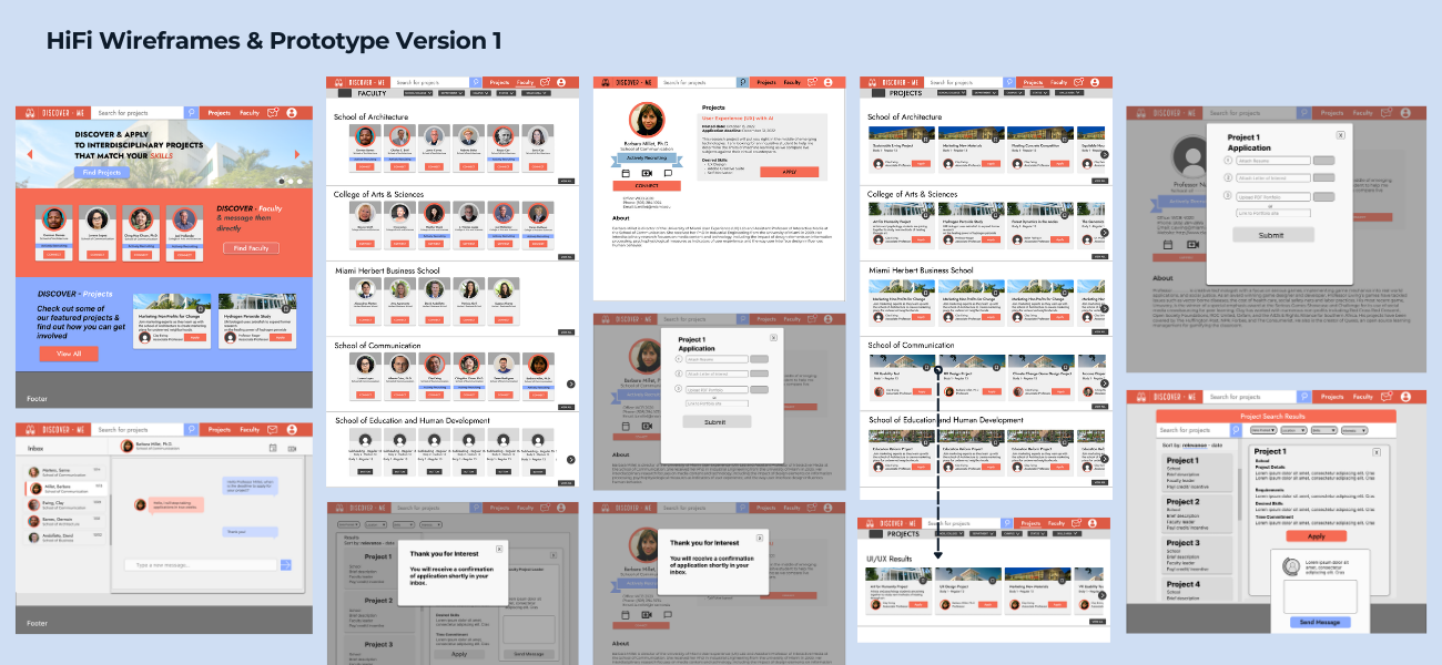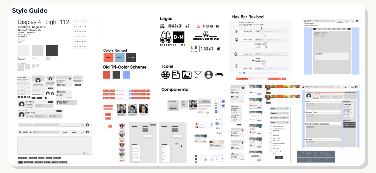 During this phase of the project, many different design solutions were proposed. Out of the many brought to the table, my partner and I decided to move forward with Discover-Me. Using profiles, students will be able to understand faculty background and connect through different communication methods. Users will also be able to search for projects.